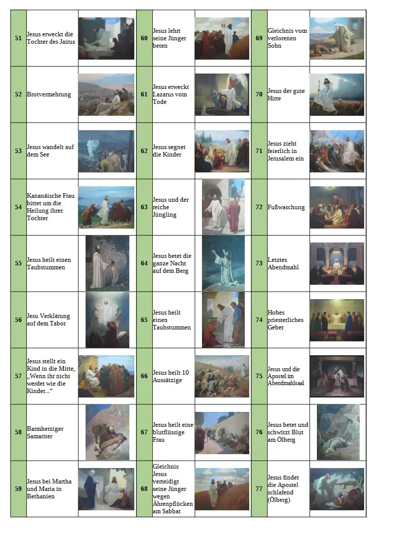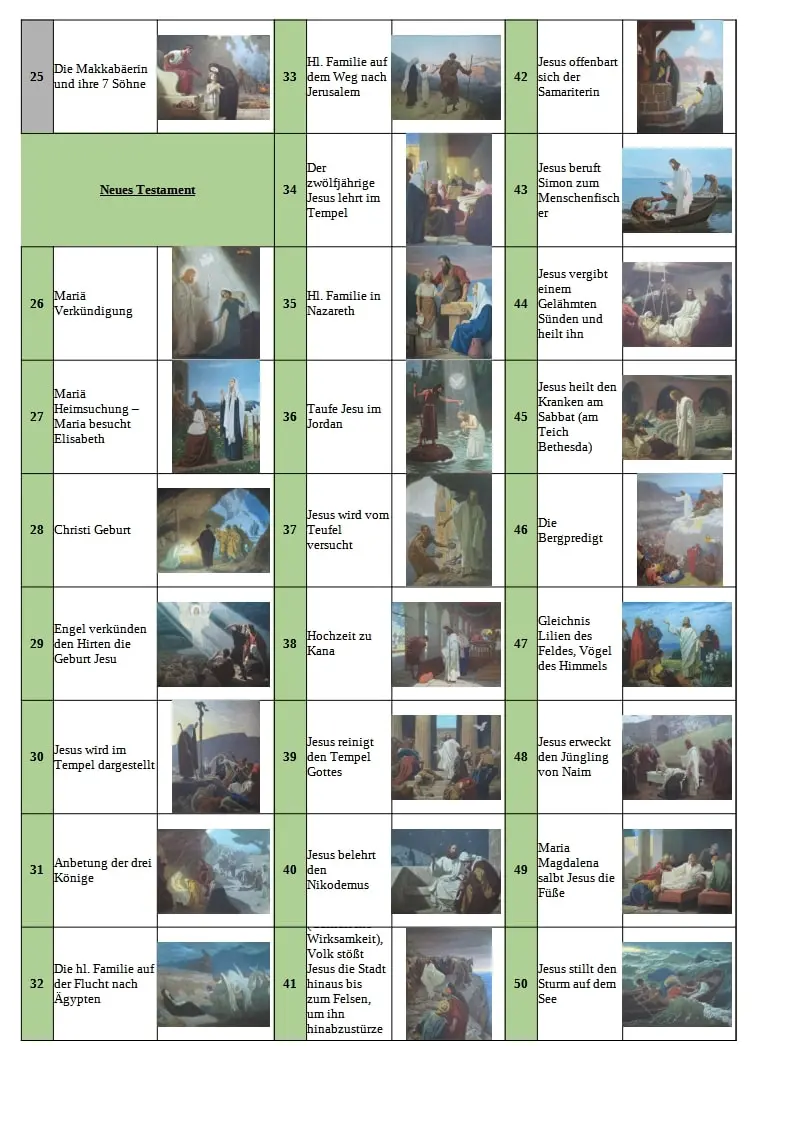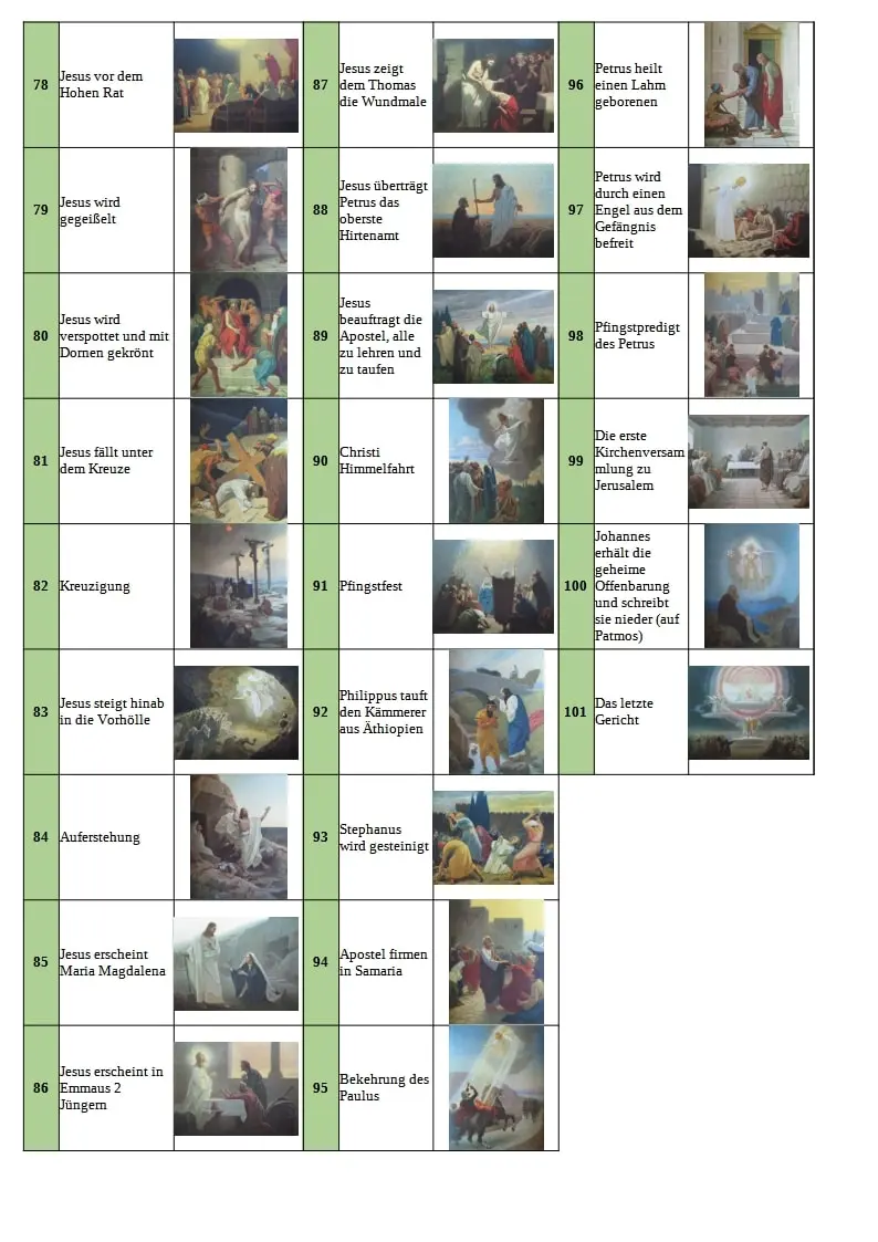 Die Darstellungen folgen einem klaren, gegenständlichen Stil und sind für die Verwendung in Katechese,