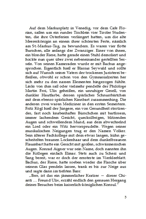 Vier Studenten unternehmen eine Reise nach Venedig. Dort gerät der Held in den Besitz eines Geheimnisses, dessen Last ihn nach der Rückkehr in die heimatlichen Berge weiter begleitet. Nach und nach entfalten sich die Zusammenhänge um den Edelstein „Das Auge der Alpen“ und führen zu einer spannungsreichen Klärung.
