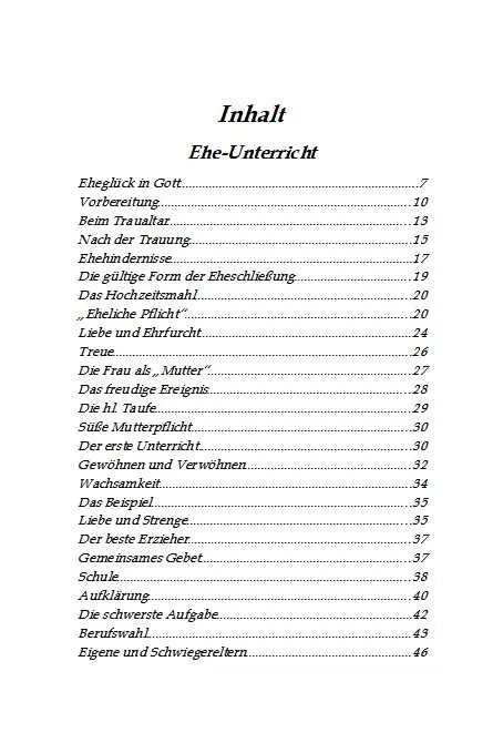 Es beginnt mit Hinweisen zur Vorbereitung auf die Ehe und führt über Ratschläge für den Hochzeitstag zu kurzen, einprägsamen Weisungen für das gemeinsame Leben der Gatten. Auch Fragen der Kindererziehung werden angesprochen. Die knappen Leitsätze und Verse erleichtern das Behalten und Anwenden im Alltag.