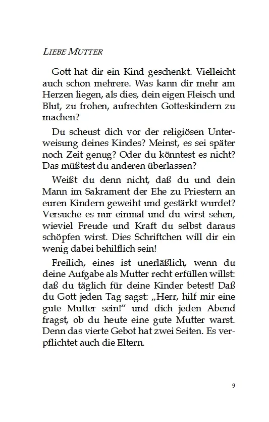 Die Schrift richtet sich besonders an Eltern – vor allem an Mütter –, die ihre Aufgabe in enger Verbindung mit dem katholischen Glauben verstehen und ihre Kinder früh zu Gott führen möchten.