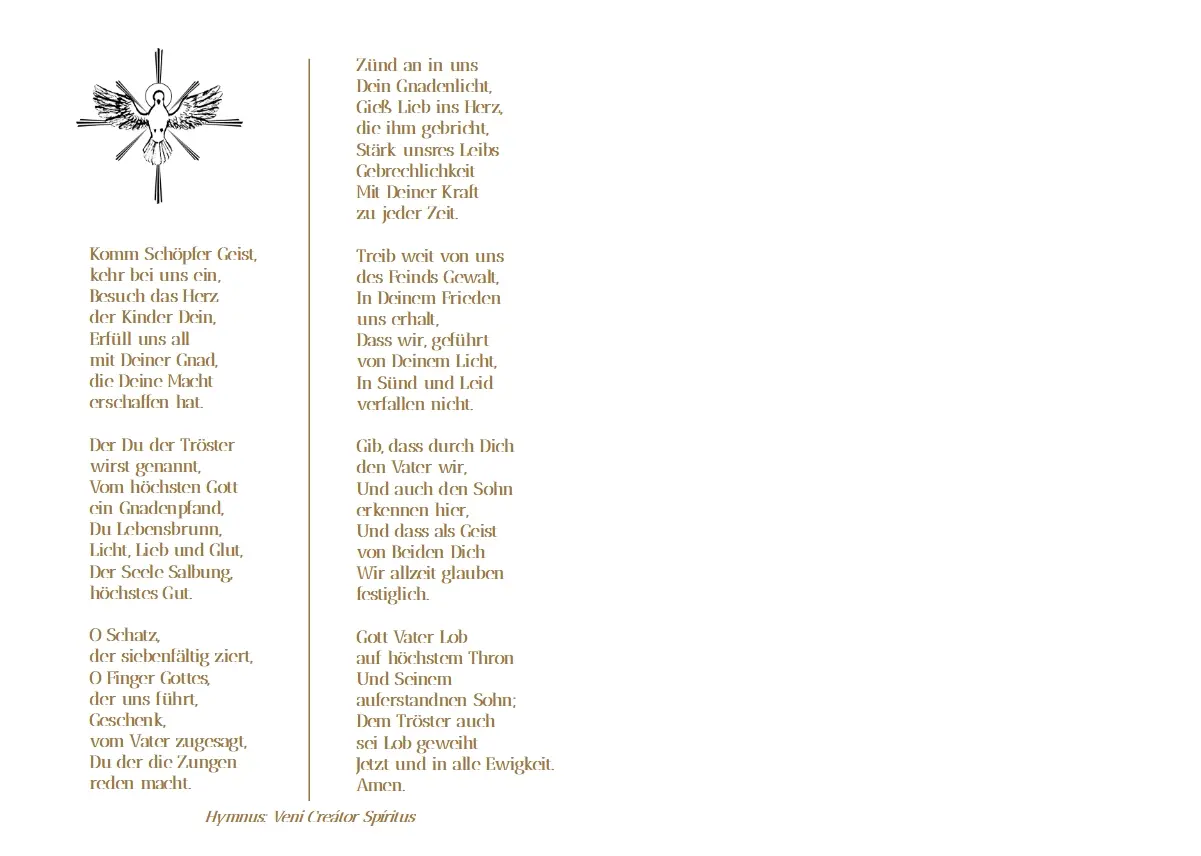 Auf der linken Innenseite befindet sich der Hymnus „Veni creator spiritus“ in deutscher Sprache.