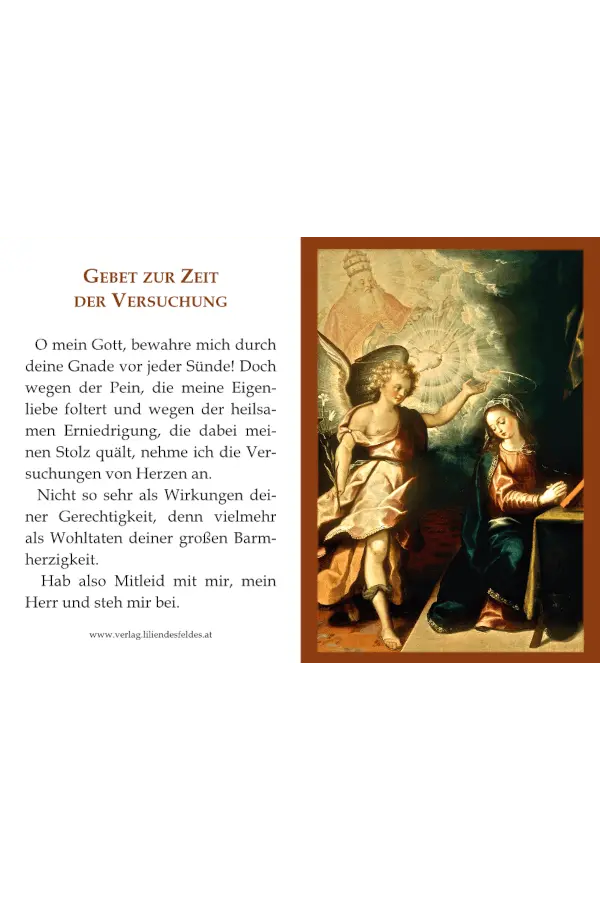 Dieses gefaltete Gebetsbild zeigt auf der Vorderseite die Verkündigung nach einem Gemälde von Luis Juárez. Auf den Innenseiten befindet sich ein Gebet des Paters de Caussade um die heilige Hingabe. Auf der Rückseite ist ein Gebet zur Zeit der Versuchung abgedruckt.