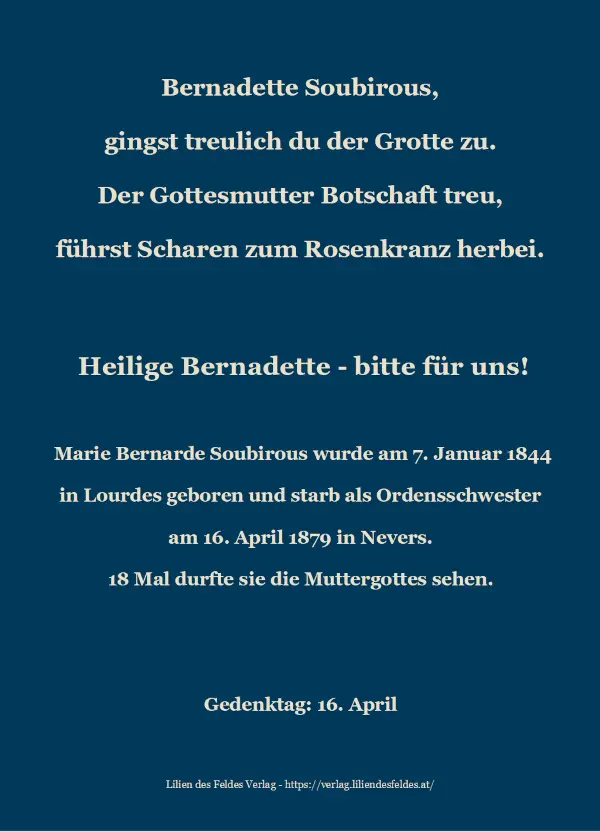 Dieses Gebetsbild zeigt die heilige Bernadette.