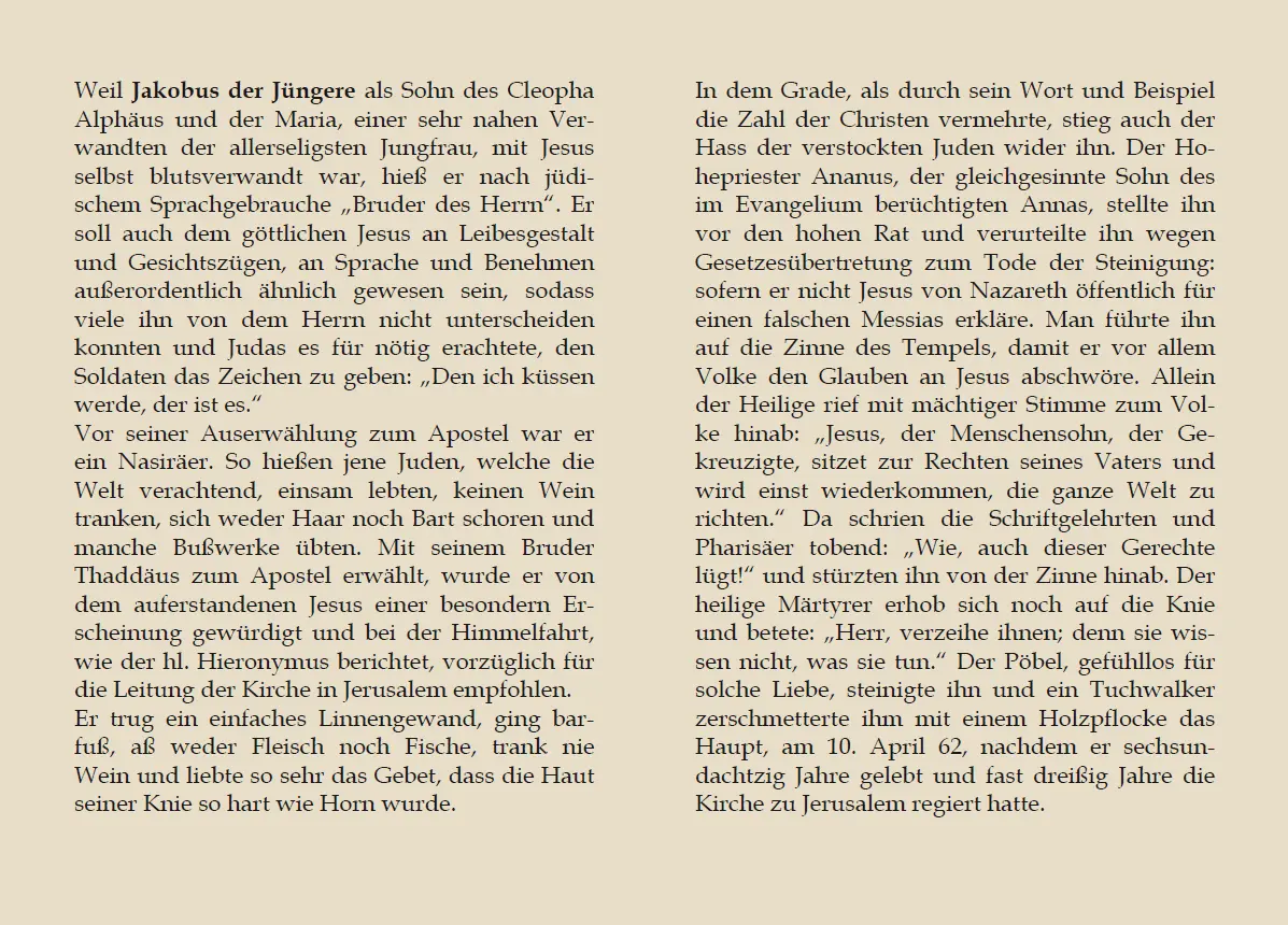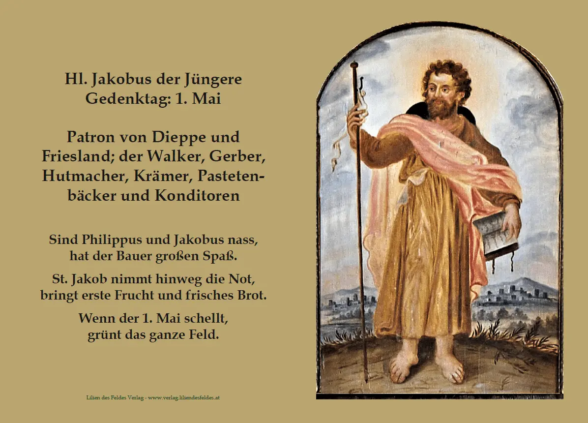 Auf den Innen- und Rückseiten sind eine kurze Lebensbeschreibung, der Gedenktag, die Patronate sowie überlieferte Bauernregeln zusammengestellt.