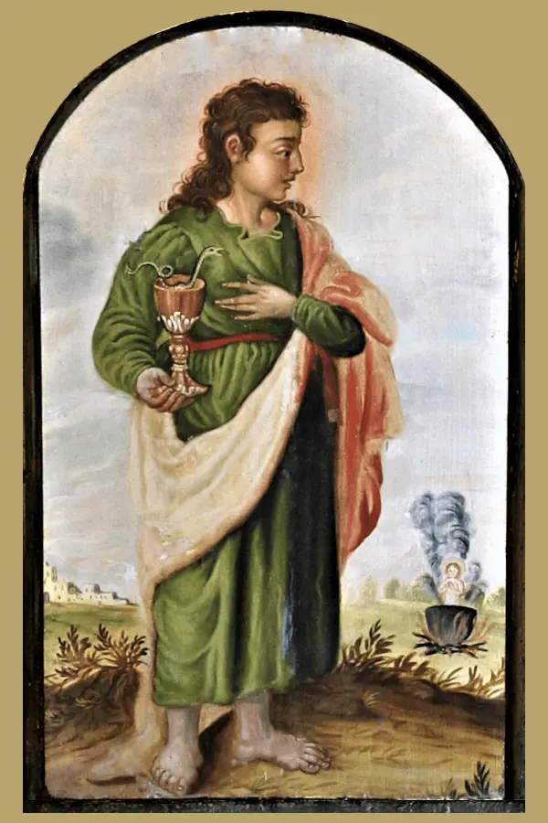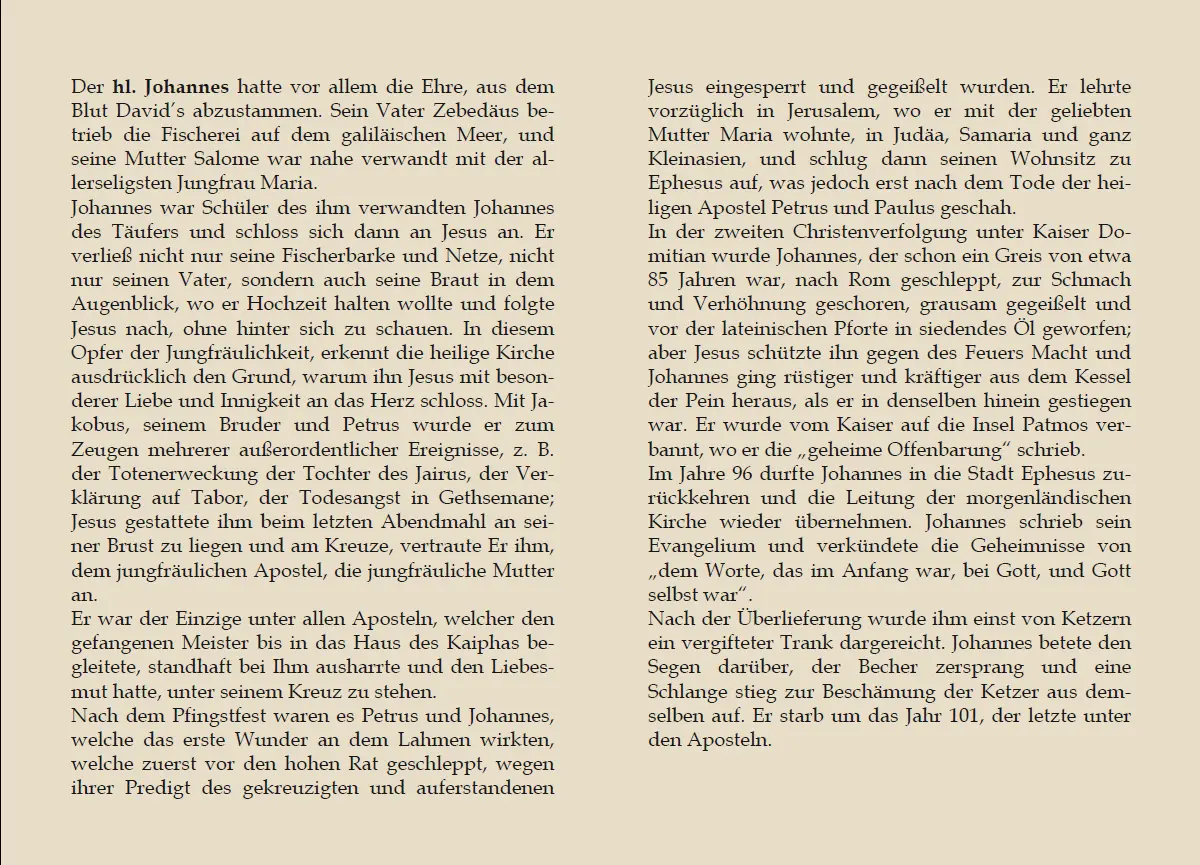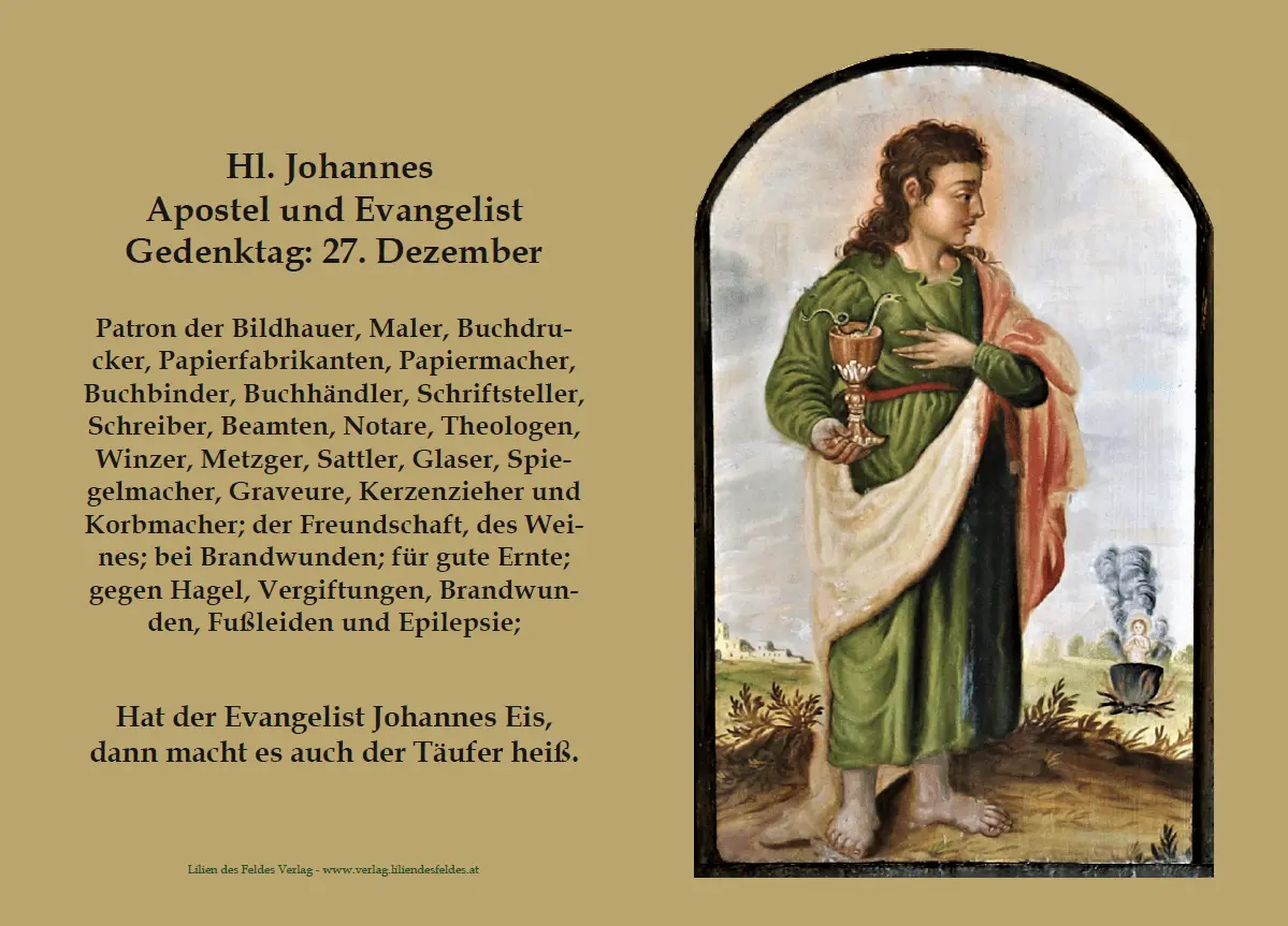 Dieses Andachtsbild zeigt den heiligen Apostel und Evangelisten Johannes. Auf dem Bild befinden sich eine kurze Lebensbeschreibung sowie Angaben zu seinem Gedenktag, seinen Patronaten und überlieferte Bauernregeln. Das Bild eignet sich besonders zur persönlichen Andacht, als Heiligenandenken oder zur Weitergabe.