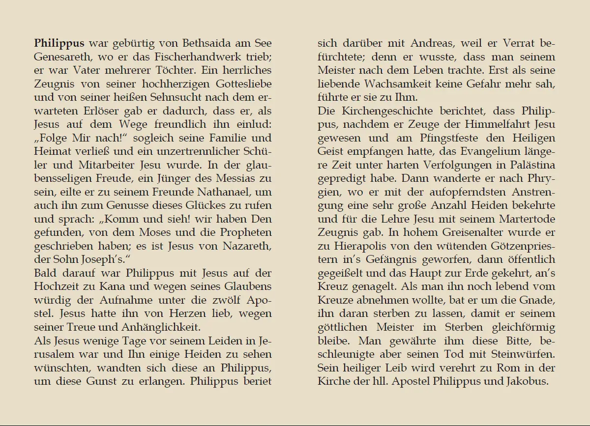 Auf den Innen- und Rückseiten sind eine kurze Lebensbeschreibung, der Gedenktag, die Patronate sowie überlieferte Bauernregeln zusammengestellt.