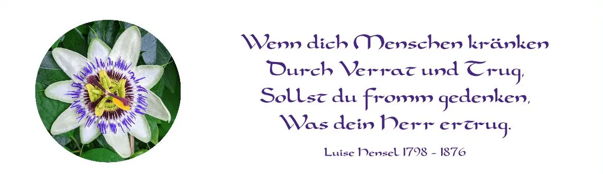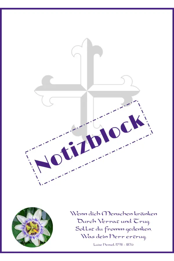 Dieser Notizblock im Format DIN A6 zeigt eine Passionsblume mit Kreuzmotiv und trägt einen geistlichen Vers von Luise Hensel. Der aufgedruckte Text lautet: Luise Hensel (1798–1876)