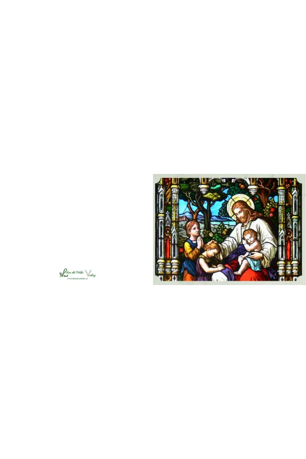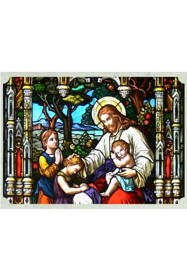 Diese Klappkarte zeigt ein Glasfenster mit Jesus, der Kinder segnet.