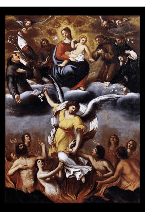 Diese gefaltete Karte zeigt ein Fegefeuer-Motiv nach Annibale Carracci (1560–1609).